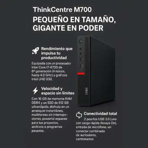 Descubre la potencia que cabe en la palma de tu mano. La ThinkCentre M700 combina rendimiento, elegancia y eficiencia en un diseño compacto que pesa solo 1.6 kg. Ideal para profesionales exigentes de negocios, arquitectura, ingeniería, finanzas o educación, que buscan un equipo confiable y rápido para su día a día.